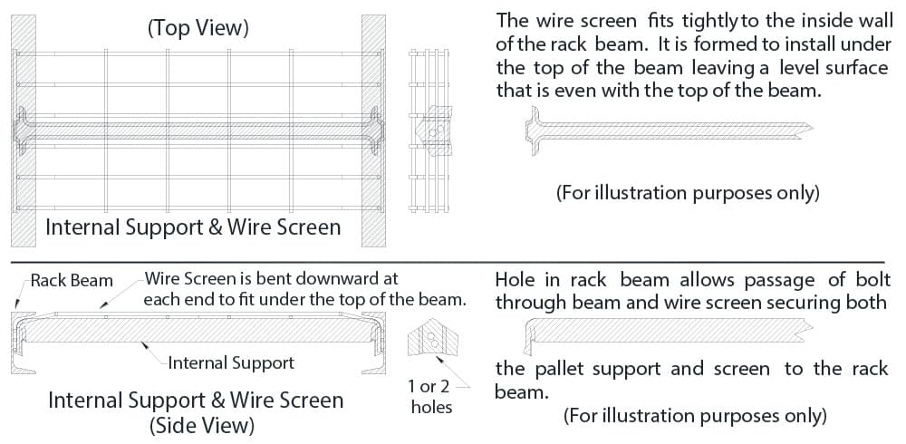 Another innovation from J&L Wire, a leader in wire decking, has created a galvanized internal structural pallet support that is integrated with the rack and our galvanized wire screens. This approach creates standard sized decking that can be utilized with most applications while becoming an integral part of the storage rack. The number of supports integrated with the screens determines its load capacity as with standard decks found in the market today. Typically, 3 or 4 integrated pallet supports are used with these screens to assure the required strength, but additional supports may be applied, as necessary. The front and back sections of the screens are bent downward to fit snuggly under the lip of the rack beam. The 14 GA internal supports complete the product.